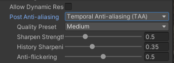Small lines and objects sometimes would cause flicker. Very simple solution – enable Temporal Anti-aliasing